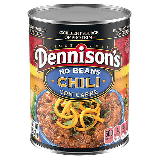 Dennison's No Bean Chili Con Carne has all the traditional taste you expect from a slow-cooking chili in a quick, easy-to-prepare 15 oz. can so you can feed the whole family. Dennison's thick and hearty chili is made with wholesome ingredients, such as vine-ripened tomatoes, premium beef, and just the right seasonings. Enjoy a delicious variety of flavors, including Vegetarian, Turkey, 99% Fat Free, and Hot Chili.